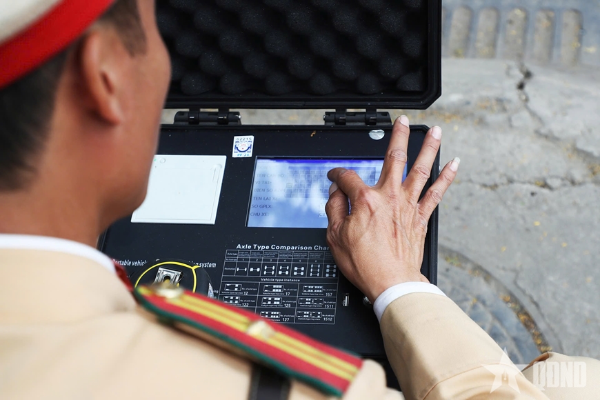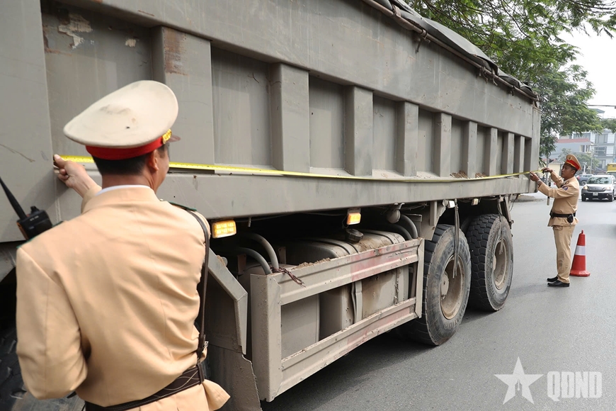 Như trường hợp ô tô tải mang biển kiểm soát 29E-152.XX do tài xế N.P.T. (quê Hưng Yên) điều khiển, tổ công tác đã yêu cầu tài xế xuất trình đầy đủ giấy tờ liên quan đến người lái và phương tiện. Đồng thời, lực lượng CSGT tiến hành đo kích thước thành thùng và cân tải trọng của phương tiện.