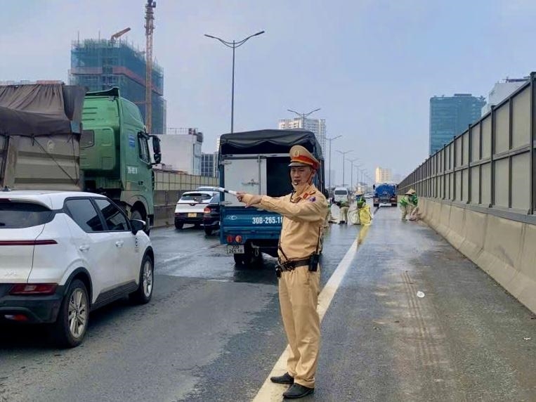 Ngày 29-3, trong quá trình thực hiện nhiệm vụ tuần tra kiểm soát trên tuyến đường Vành đai 3 trên cao, Tổ công tác thuộc Đội CSGT đường bộ số 6 (Phòng CSGT Công an TP Hà Nội) do Thượng úy Lê Thanh Hải làm Tổ trưởng đã phát hiện xe ô tô đầu kéo mang BKS 24H-014.09 kéo theo sơ mi rơ moóc BKS 24R-014.07 làm rơi vãi một lượng lớn bùn đất xuống mặt đường, tiềm ẩn nguy cơ mất an toàn giao thông cho các phương tiện khác.