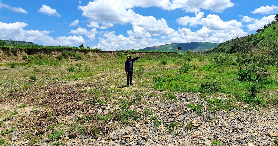 | Hàng chục héc-ta đất bằng màu mỡ ven suối của người dân buôn Tơng Rang A bị lở không còn trồng trọt được. |