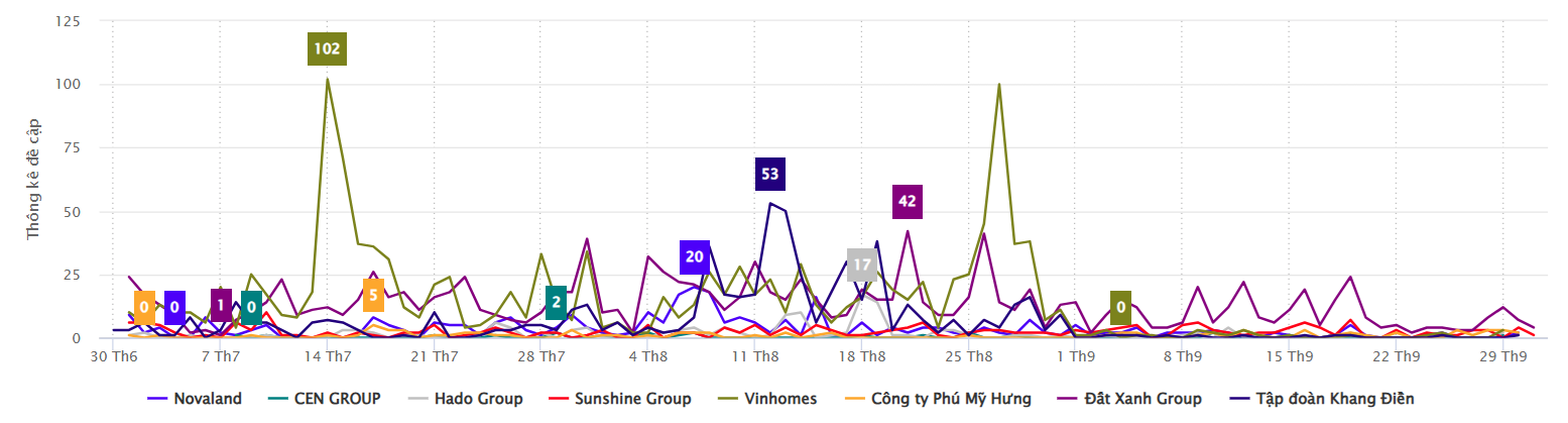 Theo báo cáo nghiên cứu và tổng hợp từ Vibiz trong quý III/2025, thị trường truyền thông ngành bất động sản tại Việt Nam tiếp tục duy trì mức độ sôi động, song cũng bắt đầu xuất hiện sự phân hóa rõ nét giữa các thương hiệu dẫn đầu và nhóm còn lại. Các doanh nghiệp lớn như Vinhomes (Công ty Cổ phần Vinhomes), Phú Mỹ Hưng (Công ty TNHH Phát Triển Phú Mỹ Hưng), Sunshine Group (Tập đoàn Sunshine Group), Novaland (Công ty Cổ phần Tập đoàn Đầu tư Địa ốc No Va), Đất Xanh Group (Công ty Cổ phần Tập đoàn Đất Xanh), Hado Group (Tập đoàn Hà Đô) và Khang Điền (Tập đoàn Khang Điền) tiếp tục đầu tư mạnh mẽ cho các hoạt động truyền thông số, đặc biệt là trên các nền tảng mạng xã hội, báo điện tử và kênh truyền thông trực tuyến. Trong bối cảnh thị trường có dấu hiệu chững lại ở một số phân khúc, các thương hiệu này đang tập trung tái định vị hình ảnh, đẩy mạnh chiến dịch truyền thông sáng tạo và tăng cường tương tác với khách hàng nhằm duy trì sức hút và củng cố niềm tin từ công chúng.